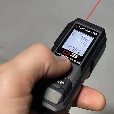 Kompakt laser afstandsmåler UNIKS D3 med laser sigte. Måler op til 30 meter og beregner areal og rumfang. Belyst display og Pythagoras funktion. Leveres med etui.