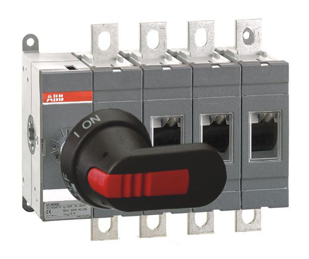 ABB OT250E04P lastafbryder med frontbetjening, 250A, 4 polet og bundmontering. Ideel som hovedafbryder eller sikkerhedsafbryder.