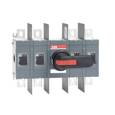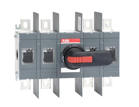 4-polet lastafbryder OT400U22P fra ABB, 400A ved 600V, UL 98, bundmontage, IP65 drejegreb, frontmontage og bolttilslutning.