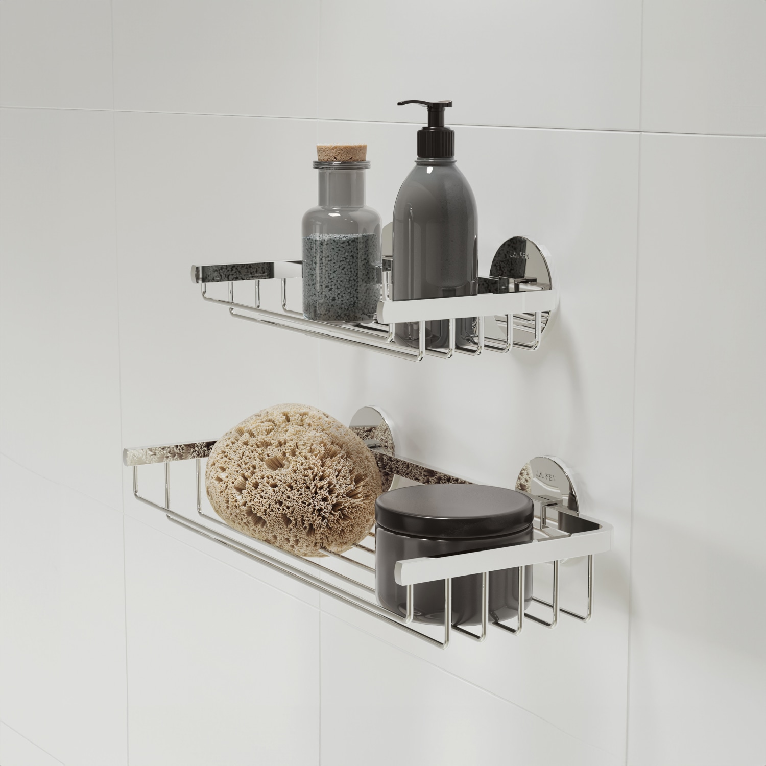 Praktisk brusekurv fra LAUFEN CANA i krom til opbevaring af håndsæbe og andre småting i brusekabinen.
