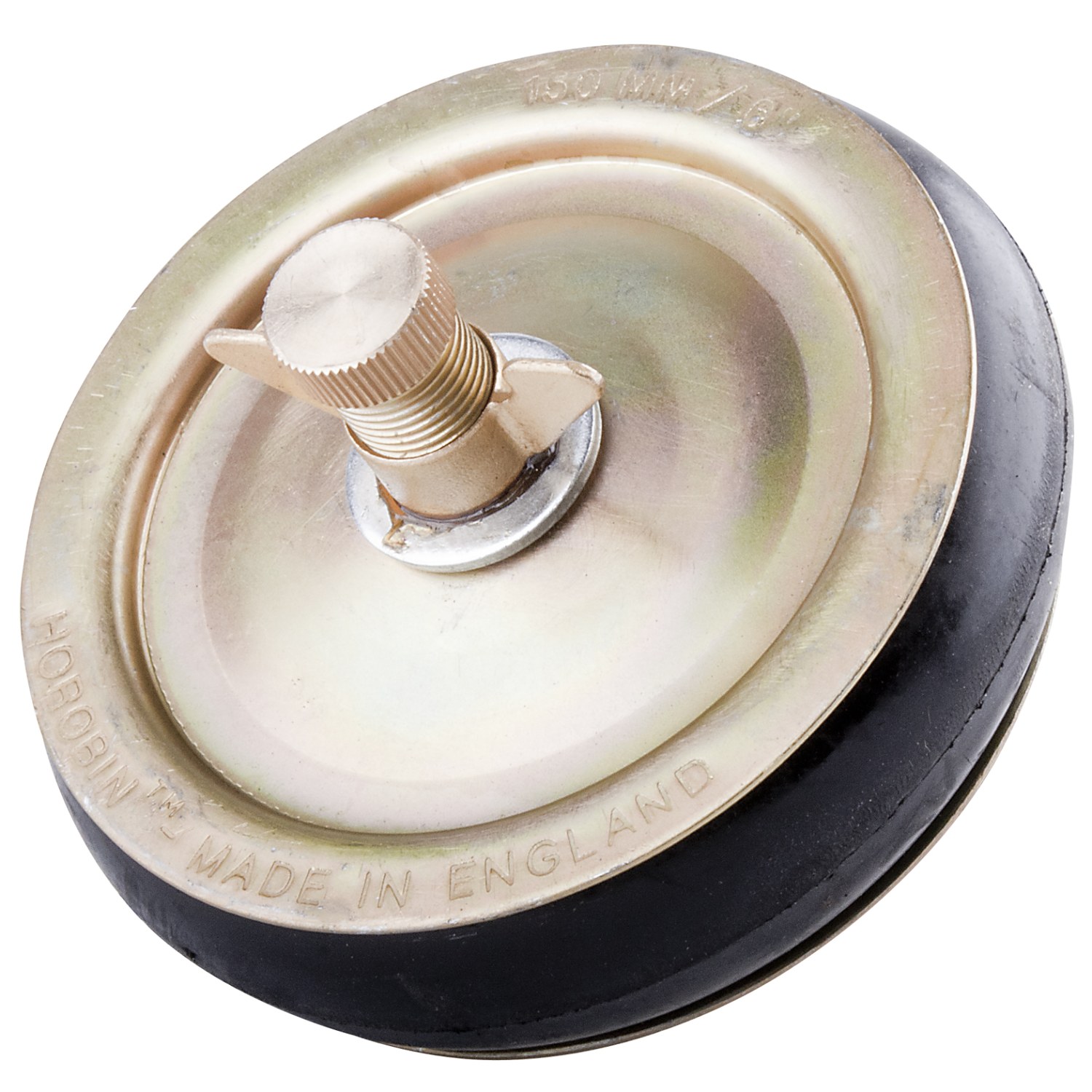 Med sin justerbare tætningsgummi, der strammes med en vingemøtrik, sikrer denne afspærringsskive en tæt og sikker forsegling i rør med diametre fra 50 mm til 62 mm.
