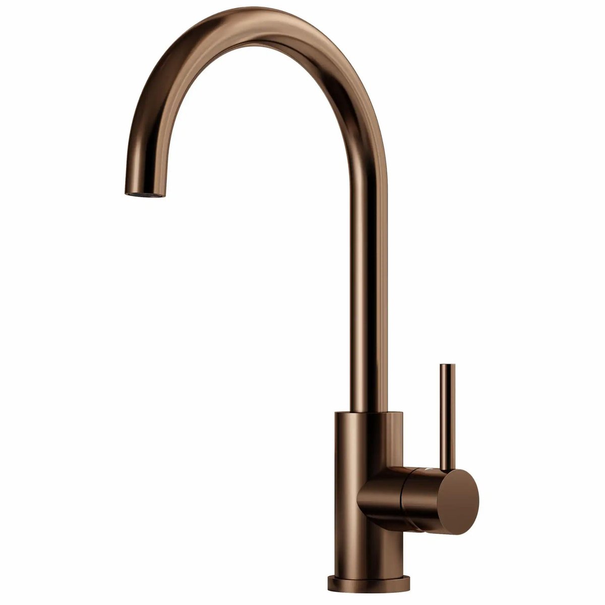 Stilrent Lavabo Kubus 140 RS køkkenarmatur med runde, bløde linjer og elegant greb. Perfekt til minimalistisk, skandinavisk stil. Fremstillet i rustfrit stål med kobber PVD overflade.