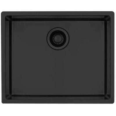 Moderne firkantet køkkenvask uden hanehul. Indvendige runde hjørner for harmonisk design og nem rengøring. Kuvertbund sikrer effektiv afløb.