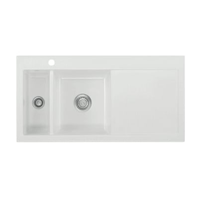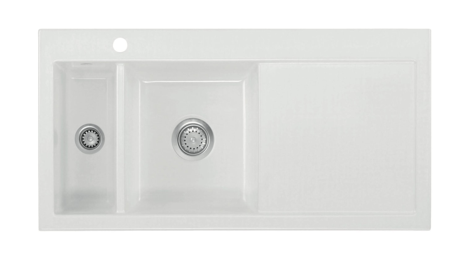 Lavabo Mera 100 er en hvid keramik køkkenvask med 1½-kumme og en praktisk bakke, ideel til moderne køkkener.