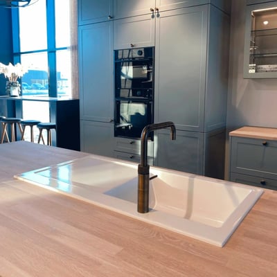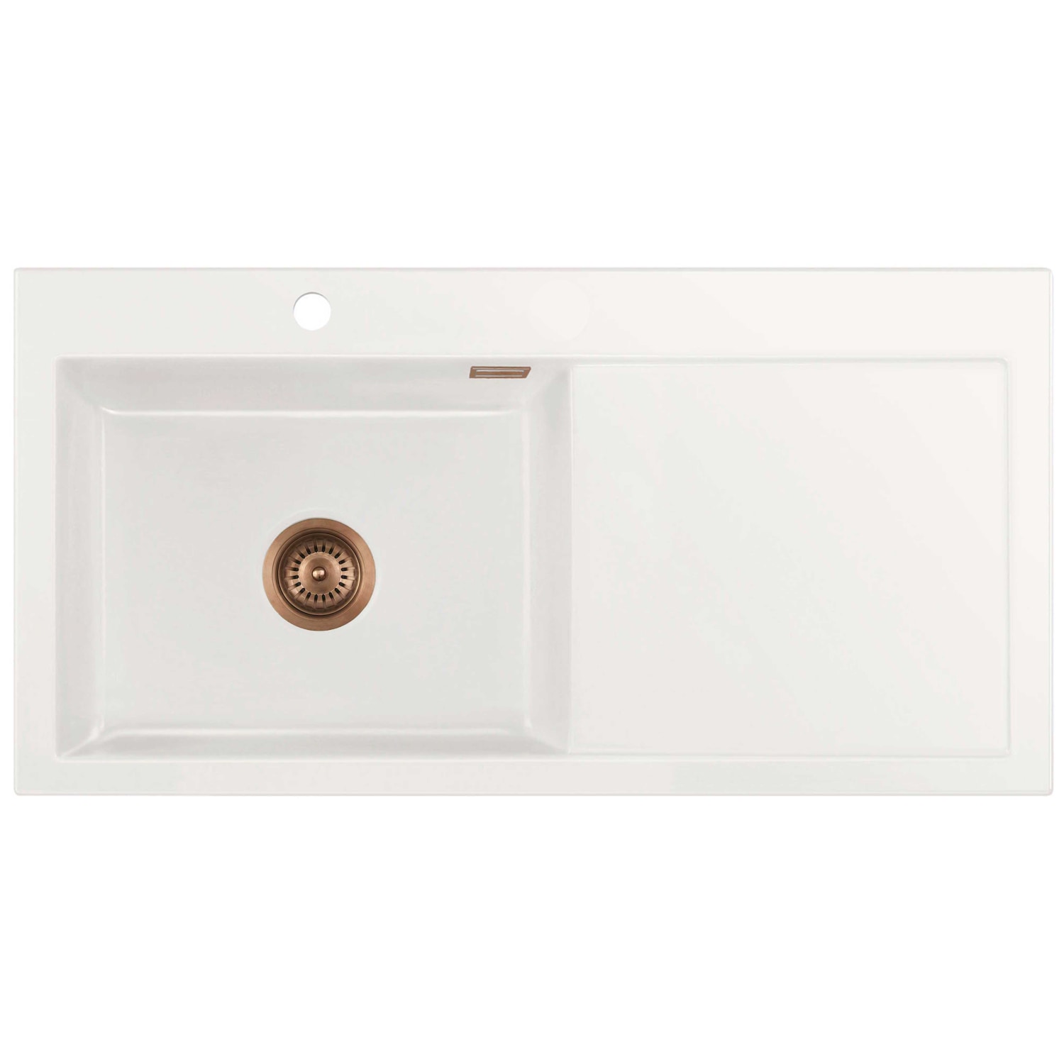 Mera 100SL keramikvask fra Lavabo med venstre bakke og hvidt kobber afløb. Ideel til moderne køkkener.