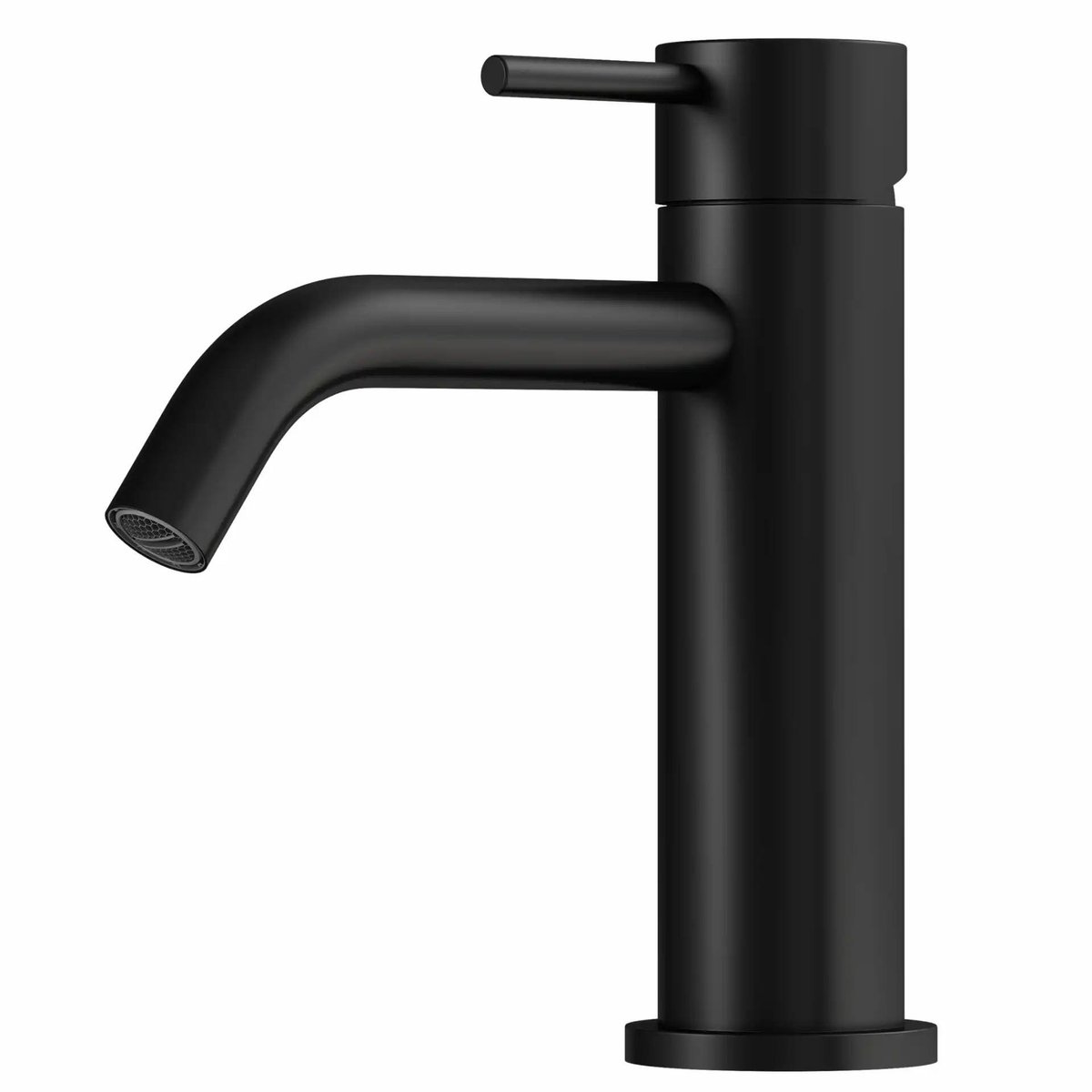 Elegant Mira 140 håndvaskarmatur i stilrent design, perfekt til små og mellemstore håndvaske. Fremstillet i rustfrit stål med matsort PVD-overflade.