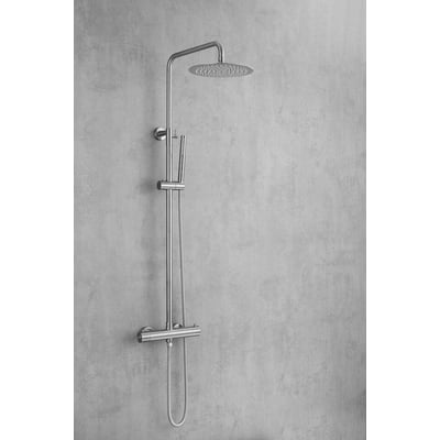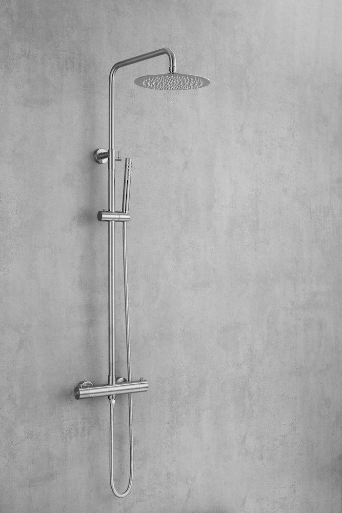 Elegant og tidløst brusesæt i børstet rustfrit stål. Inkluderer termostatblander, hoved- og håndbruser.