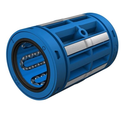 Kuglebøsning fra Ewellix med tætninger. Kuglebøsningen består af et hus i polyamid, lejebaner og kugler i stål, samt tætninger af polyurethan.
