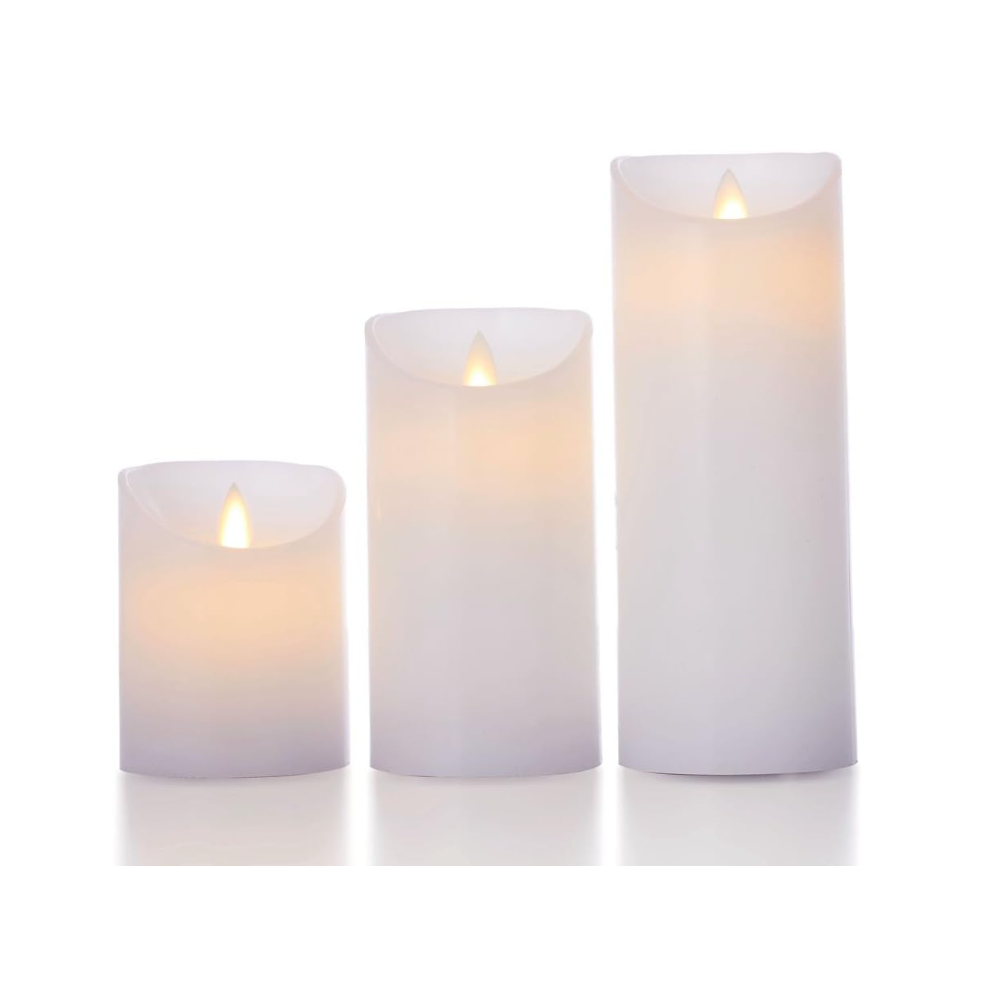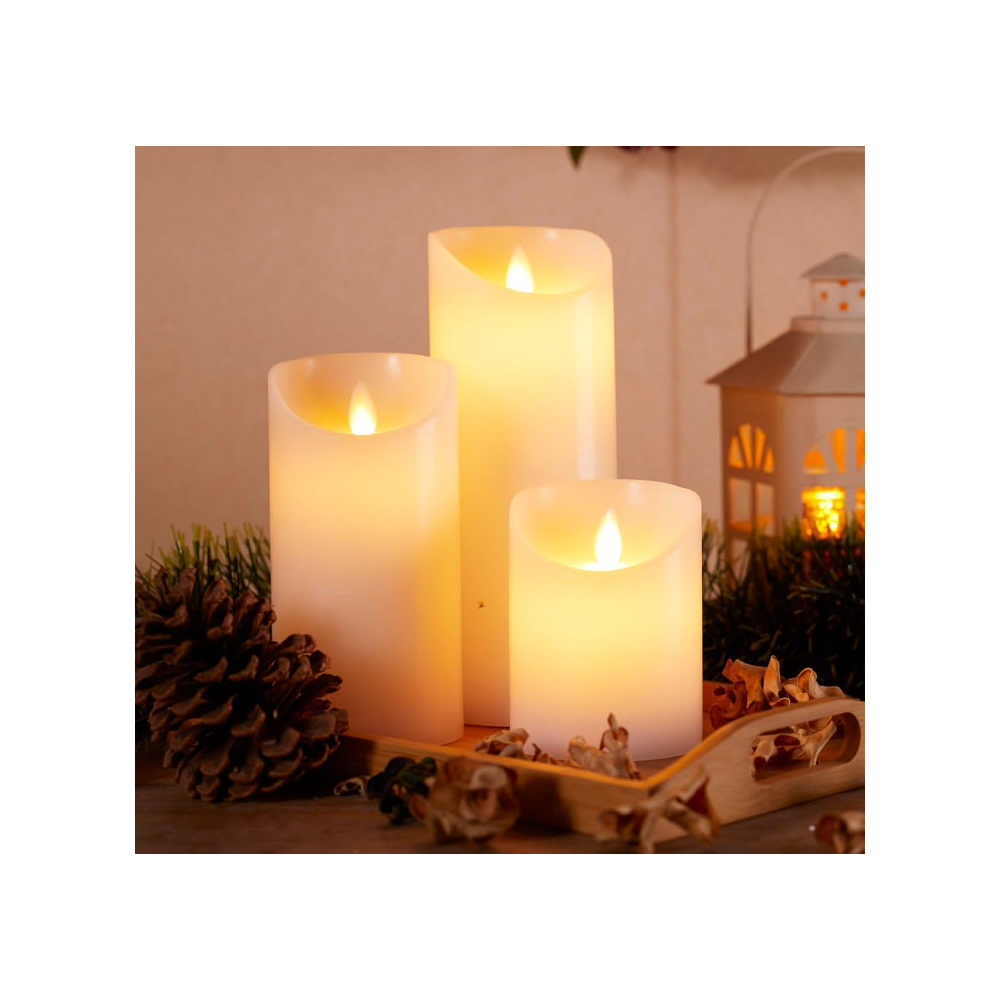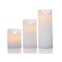 LED bloklys med bevægelig flamme. Sæt med 3 hvide lys i ægte stearin. Inkl. fjernbetjening og timer.