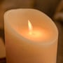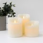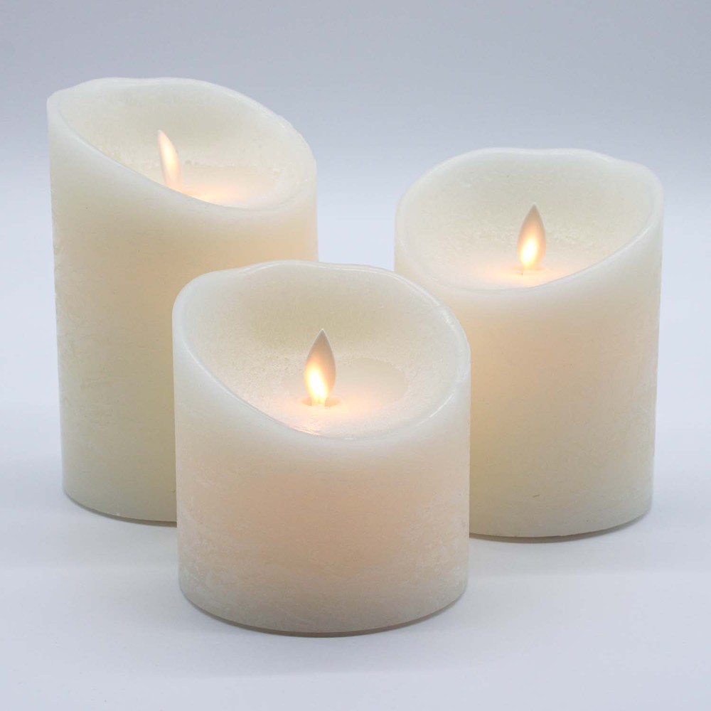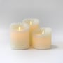 Sæt med 3 hvide LED bloklys af ægte stearin med realistisk bevægelig flamme, fjernbetjening og timerfunktion. Perfekt til hyggelig belysning.