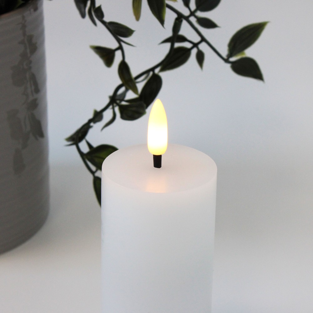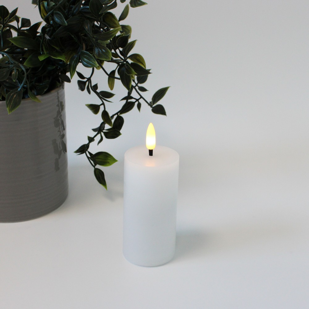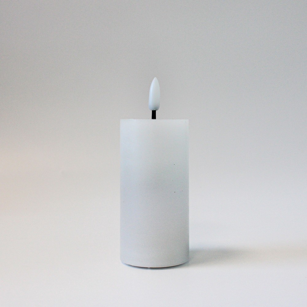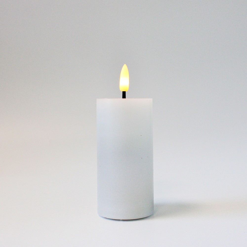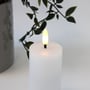 Skab hygge med et LED bloklys med naturtro flammeeffekt. Hvidt stearinlys med fjernbetjening og timerfunktion. H: 10 cm, Ø: 5 cm.