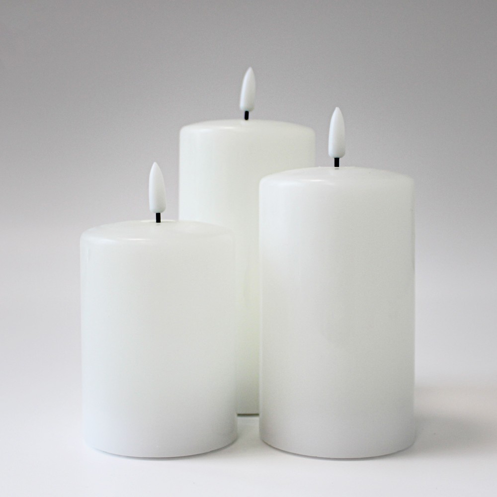 Dette sæt indeholder tre hvide LED bloklys med en naturtro flammeeffekt, der skaber en hyggelig atmosfære i ethvert rum. Lysene er fremstillet af ægte stearin, hvilket giver dem et autentisk udseende og en blød overflade.