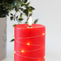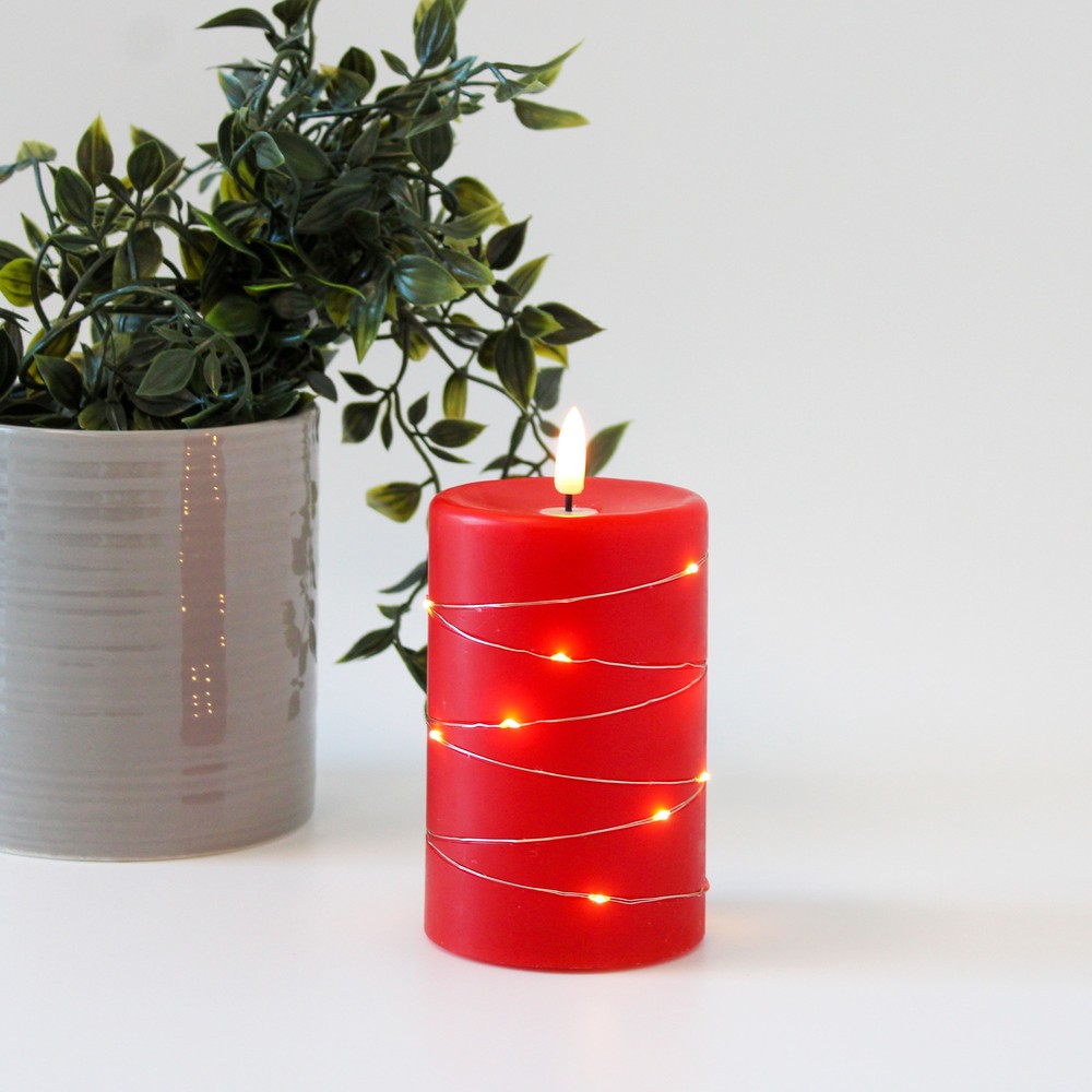 Rødt LED bloklys af ægte stearin med indbygget lyskæde og realistisk flammeeffekt. Måler 12,5 cm i højden og kan betjenes med fjernbetjening.