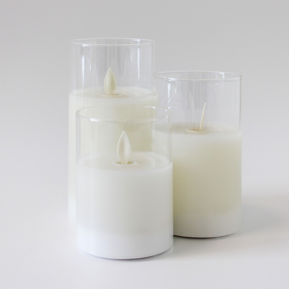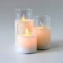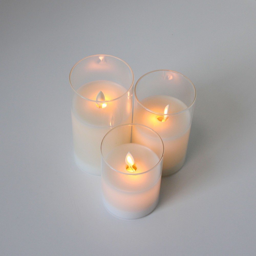 LED bloklys sæt med timer og fjernbetjening. Inkluderer 3 lys i ægte stearin og glas (10/12,5/15 cm) med vippende flamme.