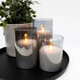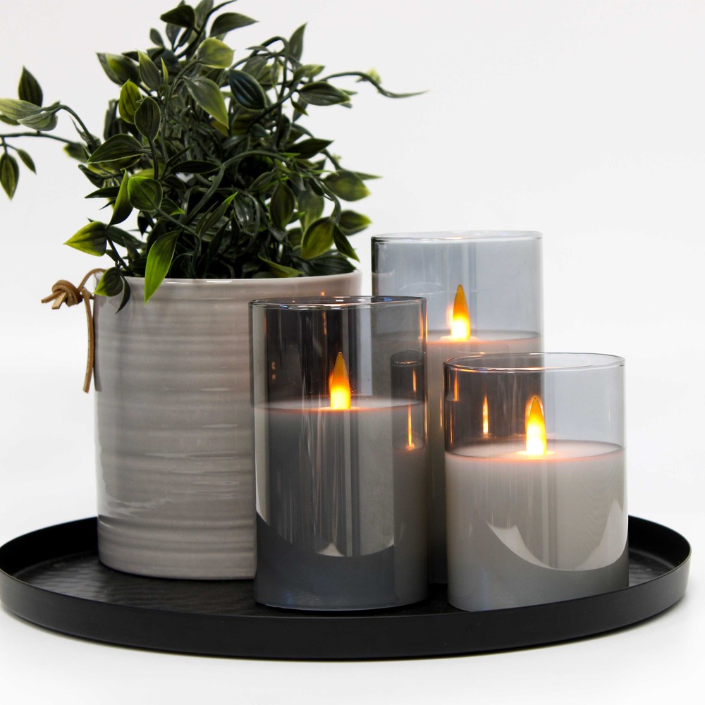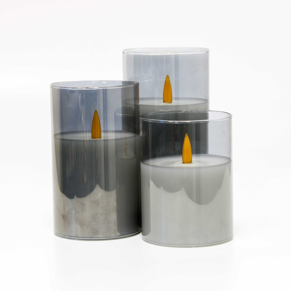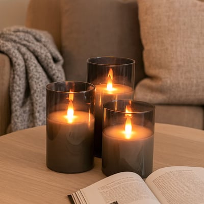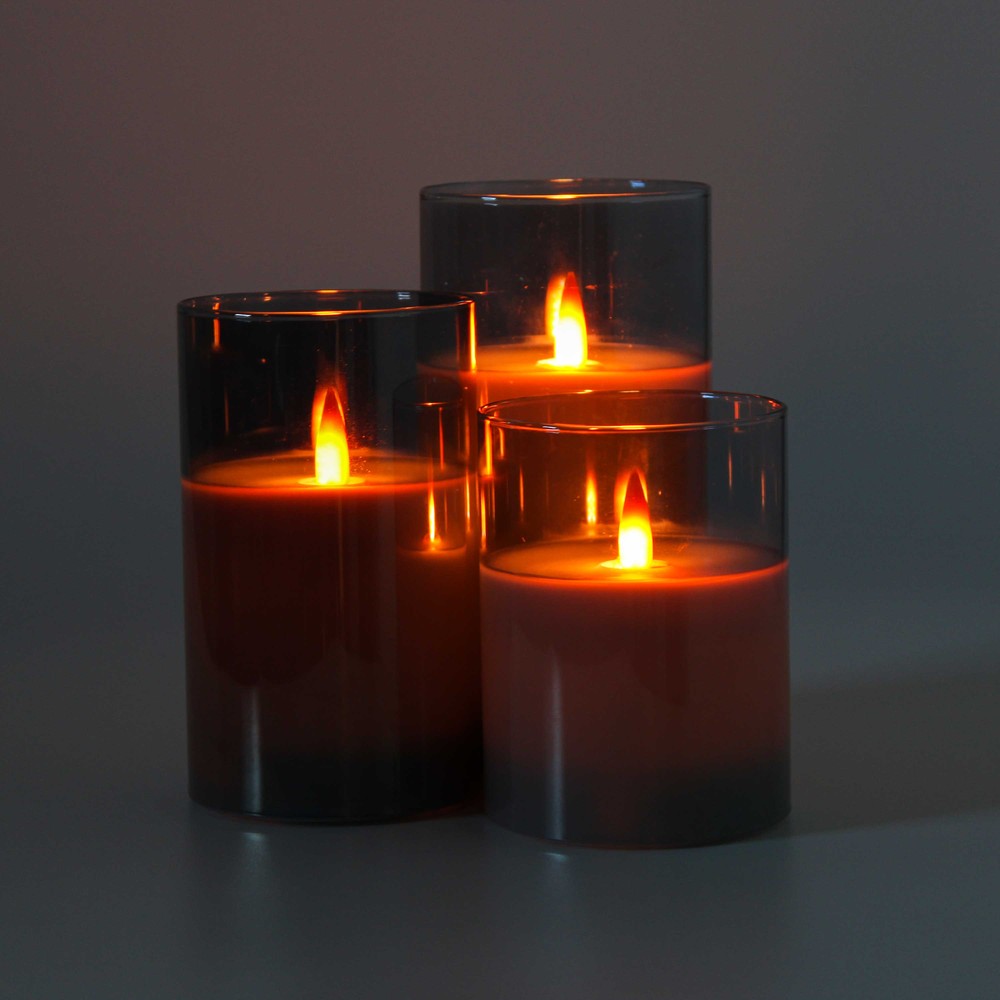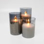 LED bloklys sæt med røgfarvet glas, 3 stk. Inkl. fjernbetjening og timer. Højde: 10/12,5/15cm. Med ægte stearin.