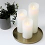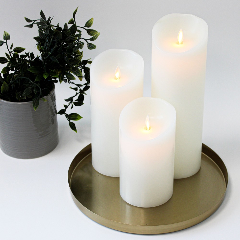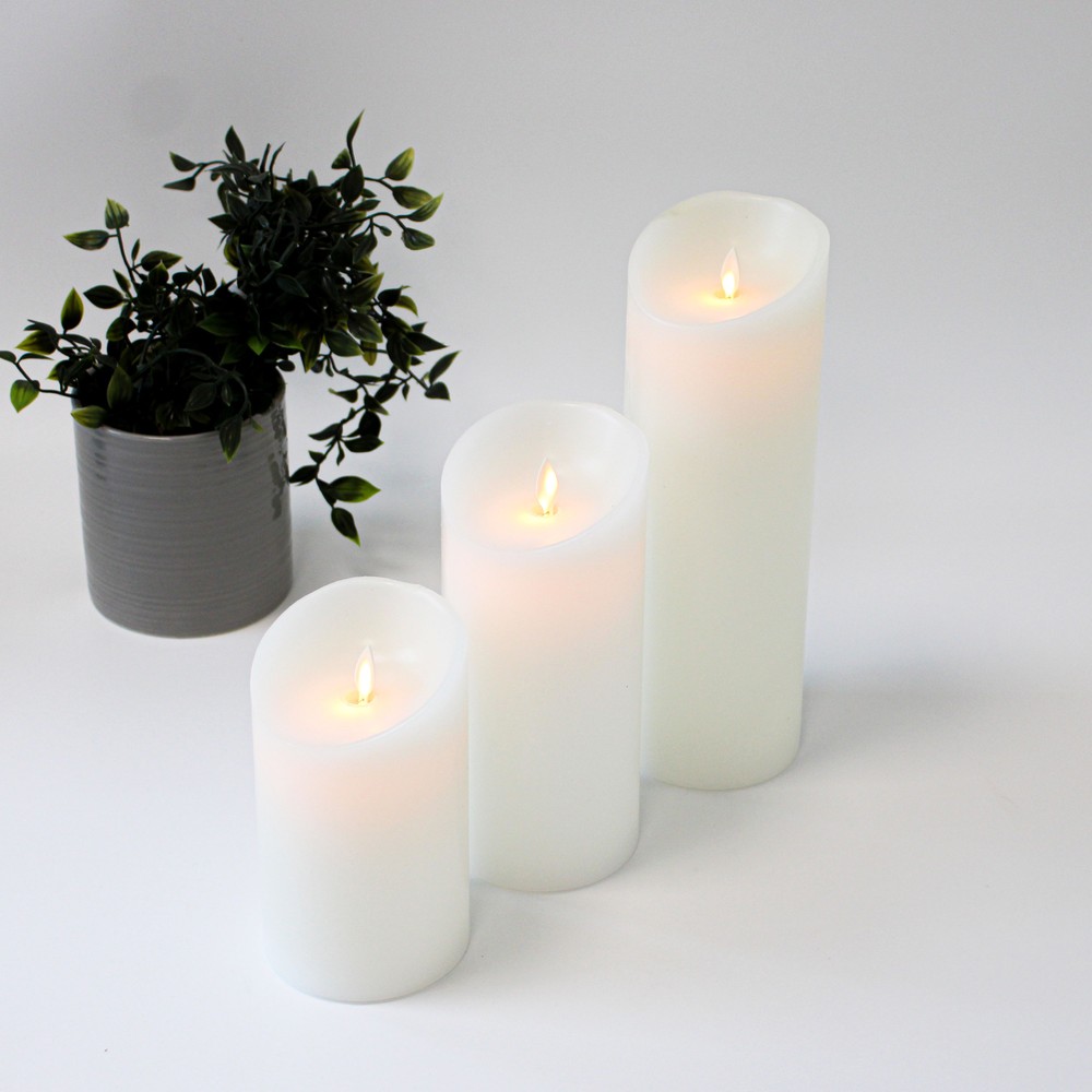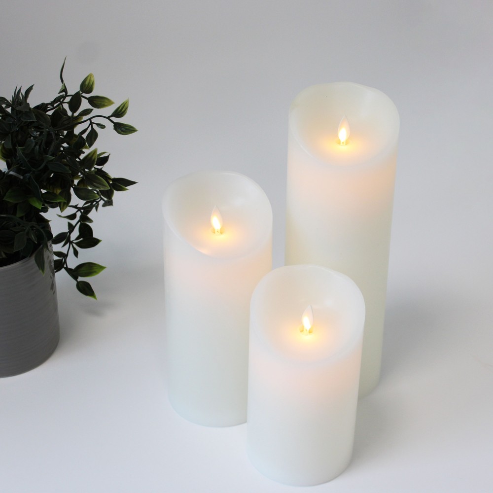 Sæt med 3 hvide LED bloklys i ægte stearin med bevægelig flamme. Inkluderer fjernbetjening og timerfunktion for nem styring.