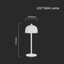 Hvid V-TAC LED bordlampe med kuppelformet skærm og rund base, fremstillet af metal med indbygget 1800mAh batteri.Den hvide V-TAC LED bordlampe oplyser et hyggeligt rum med julestemning, placeret på et bord med en uskarp baggrund af senge og lyskæder.Hvid V-TAC LED bordlampe på natbord ved siden af en seng, demonstrerer dens kompakte størrelse og stilfulde design i et soveværelsesmiljø.Illustration af V-TAC LED bordlampe med angivne dimensioner: 115mm diameter og 300mm højde, vist på mørk baggrund.Elegant V-TAC LED bordlampe i hvid med 120 graders lyskegle og teksten 'Elegant & Stylish with METAL DESIGN'.Hånd viser touch-dimming funktion på V-TAC LED bordlampe, med mulighed for farveskift fra 3000K til 6000K.V-TAC LED bordlampe viser Type C USB opladning med medfølgende kabel, placeret foran en trævæg.