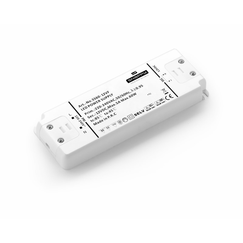 Kompakt og robust 60W LED driver fra Snappy. Leverer 24V DC og er ikke dæmpbar. Ideel til en bred vifte af LED-installationer.