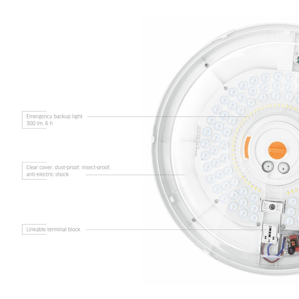 LED nødbelysning med 3000 lumen og 4000K farvetemperatur. IP44-klassificeret og designet til loftmontering med bevægelsessensor.
