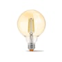 Dæmpbar G95 LED-pære med E27 fatning, 7W forbrug og 700lm lysstyrke. Ravfarvet glas og ekstra varm hvidt lys.