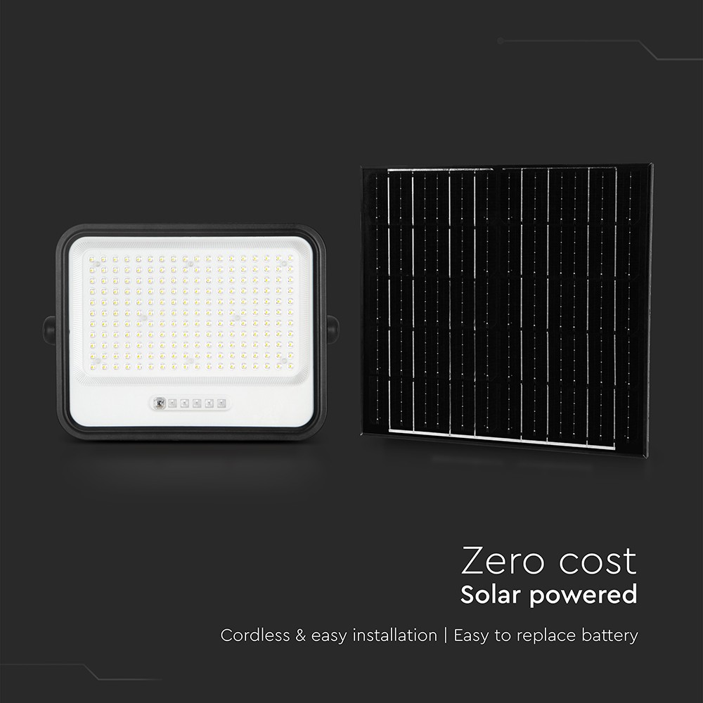 Kraftig 400W LED projektør med solpanel. Justerbar CCT (3000K-6500K), IP65-klassificeret og IK05-stødsikker. Ideel til udendørs brug.