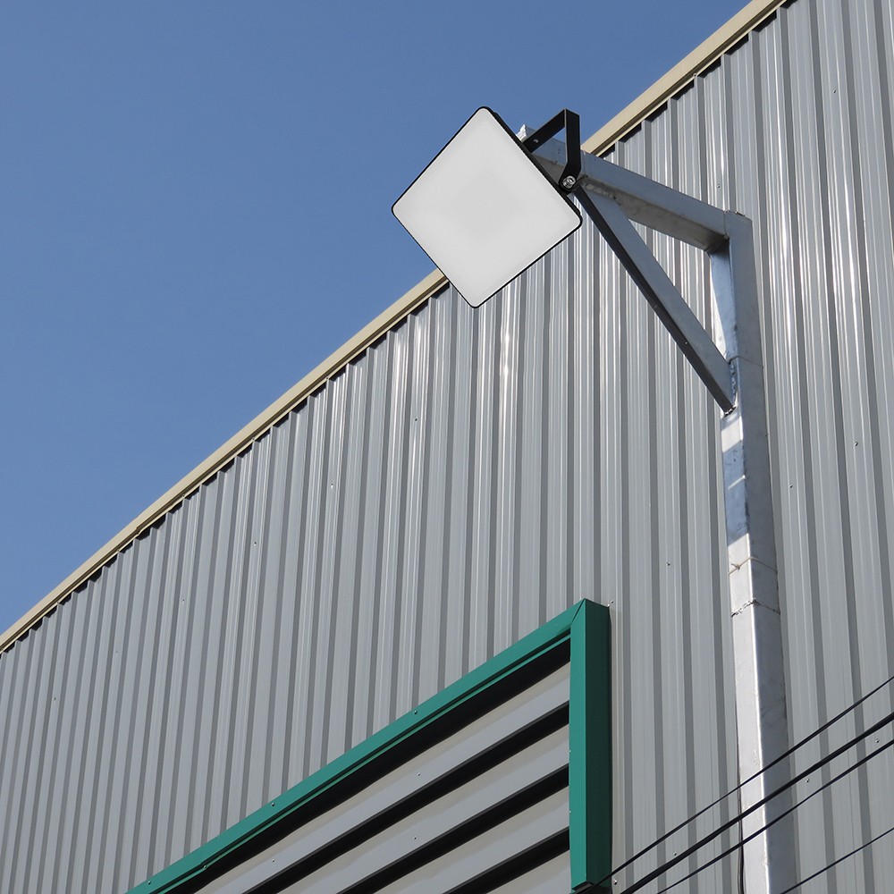 Projektøren er konstrueret med et robust hus af aluminium, der sikrer holdbarhed og effektiv varmeafledning. Med en IP65-klassificering er den beskyttet mod støv og vandstråler, hvilket gør den velegnet til brug under forskellige vejrforhold. Den brede lysspredning på 120 grader sikrer en jævn fordeling af lyset over et stort område.