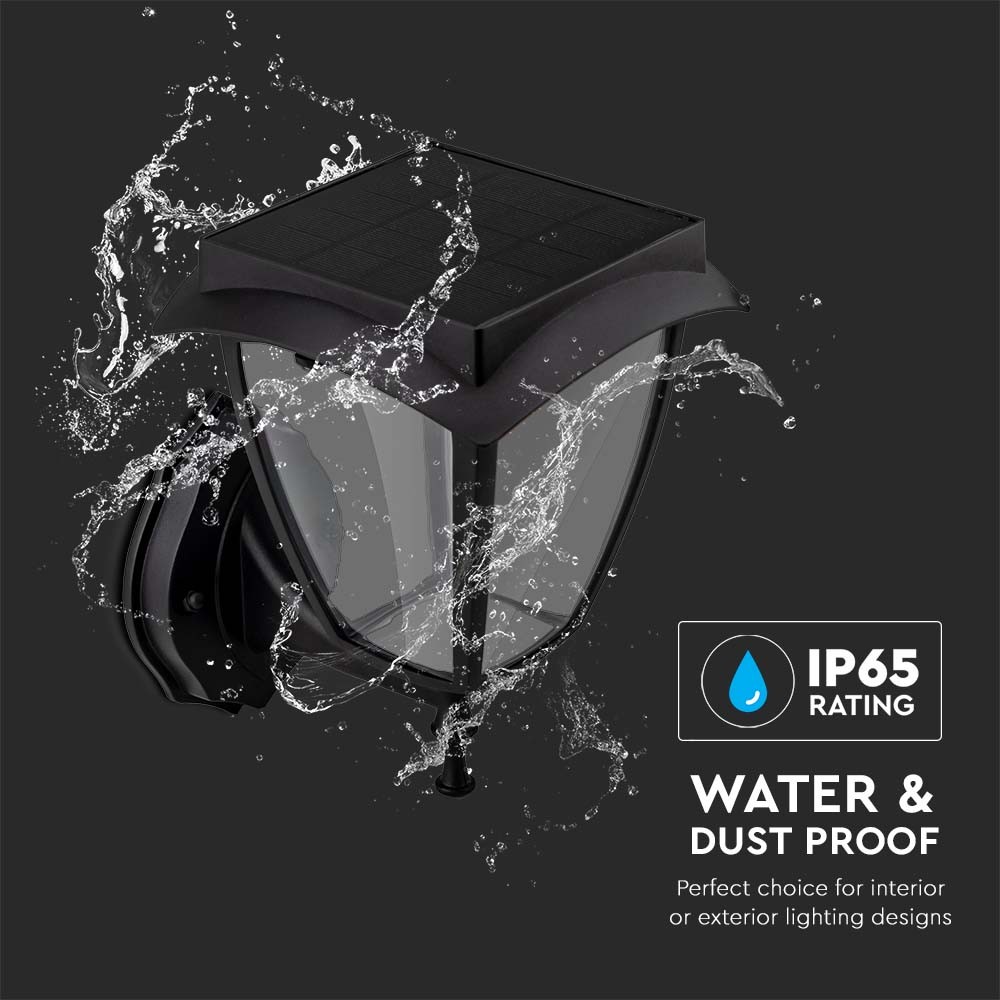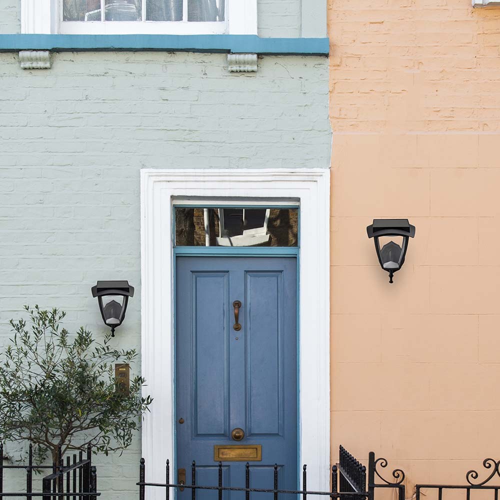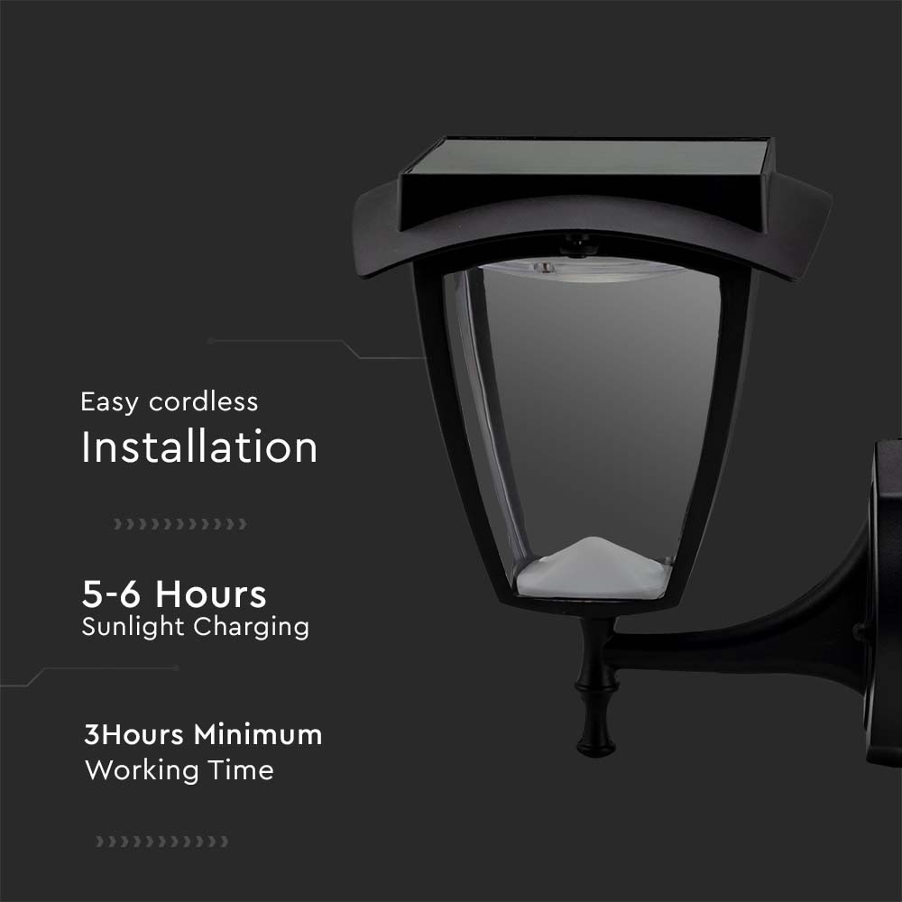 Klassisk solcelle væglampe i sort aluminium. 2W, 110 lumen med justerbar farvetemperatur fra 3000K til 6000K. IP65 klassificeret.