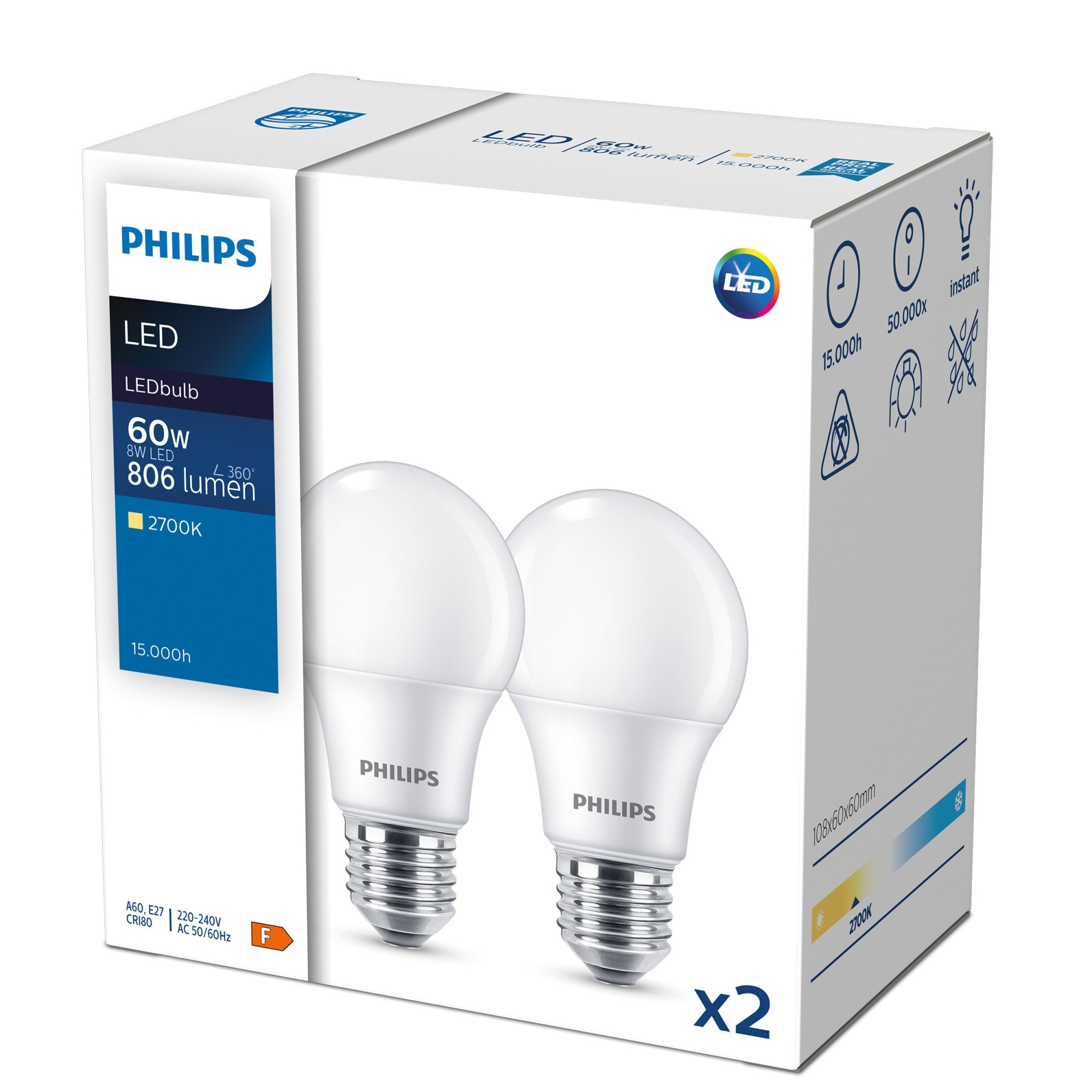 Philips LED-standardlyskilder er ideelle til almindelig belysning. Kompatibel med E27-fatninger og designet som erstatning for glødepærer. Fås i en 2-pak.