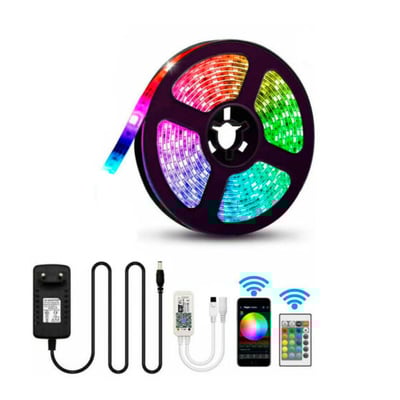 WiFi app-styret komplet LED strip på 5 meter. Nem at montere med dobbeltklæbende bagside. Der medfølger også fysisk fjernbetjening. LEDstrippen kan også bruges på badeværelse med strippens IP-klasse 65