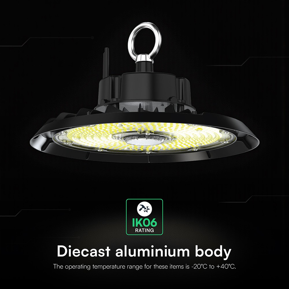Denne 100W LED high bay er designet til effektiv og pålidelig belysning i industrielle og kommercielle rum. Med en lysstyrke på 13.500 lumen og en effektivitet på 135-160 lm/W leverer den kraftfuld og energibesparende belysning.