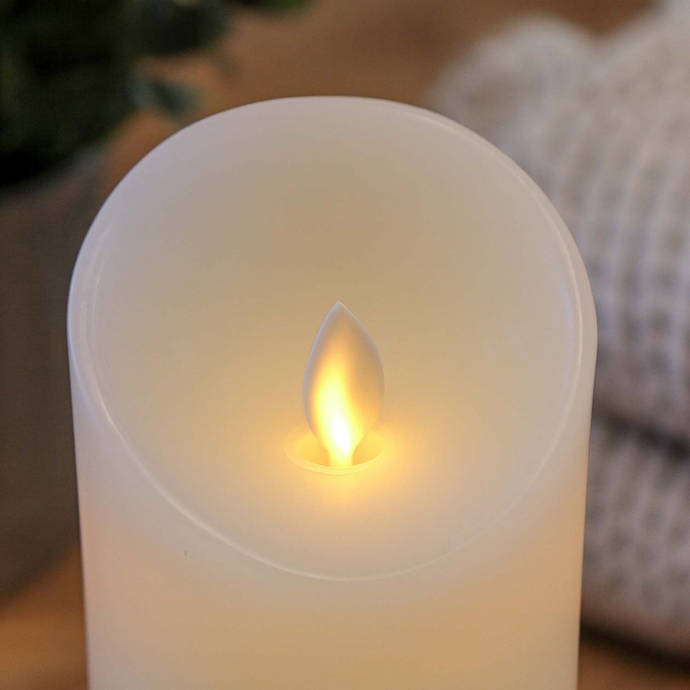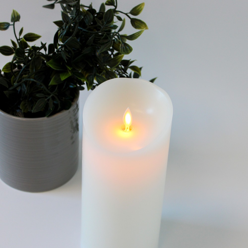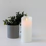 LED bloklys med naturtro flammeeffekt, fjernbetjening og timerfunktion. Fremstillet af ægte stearin.