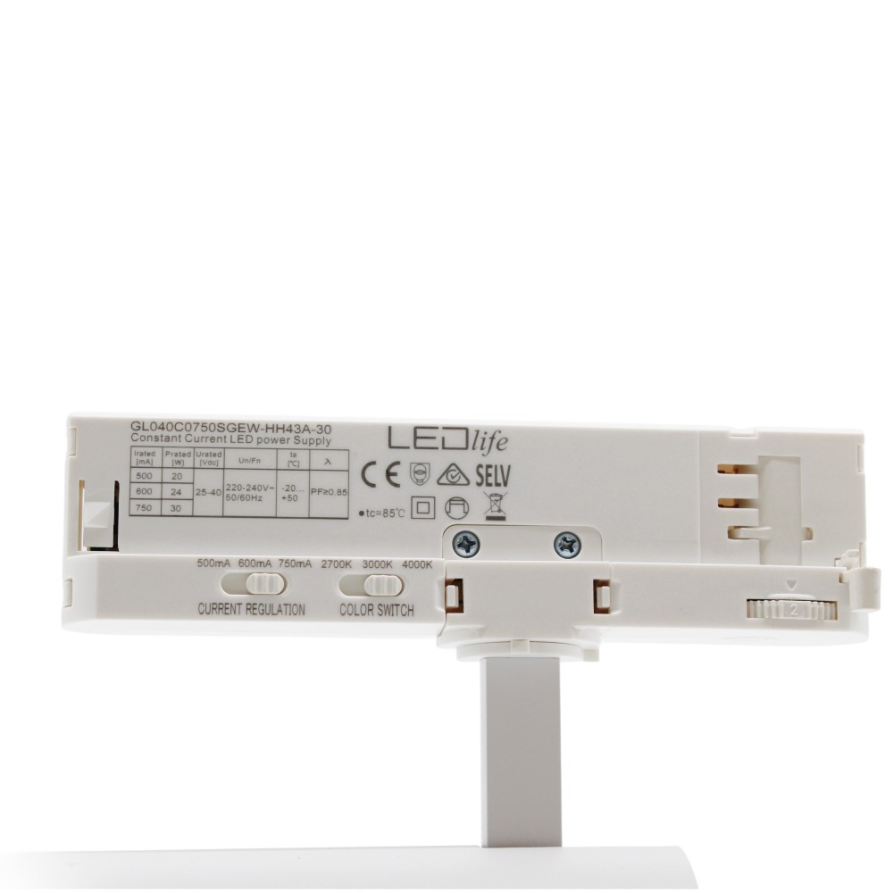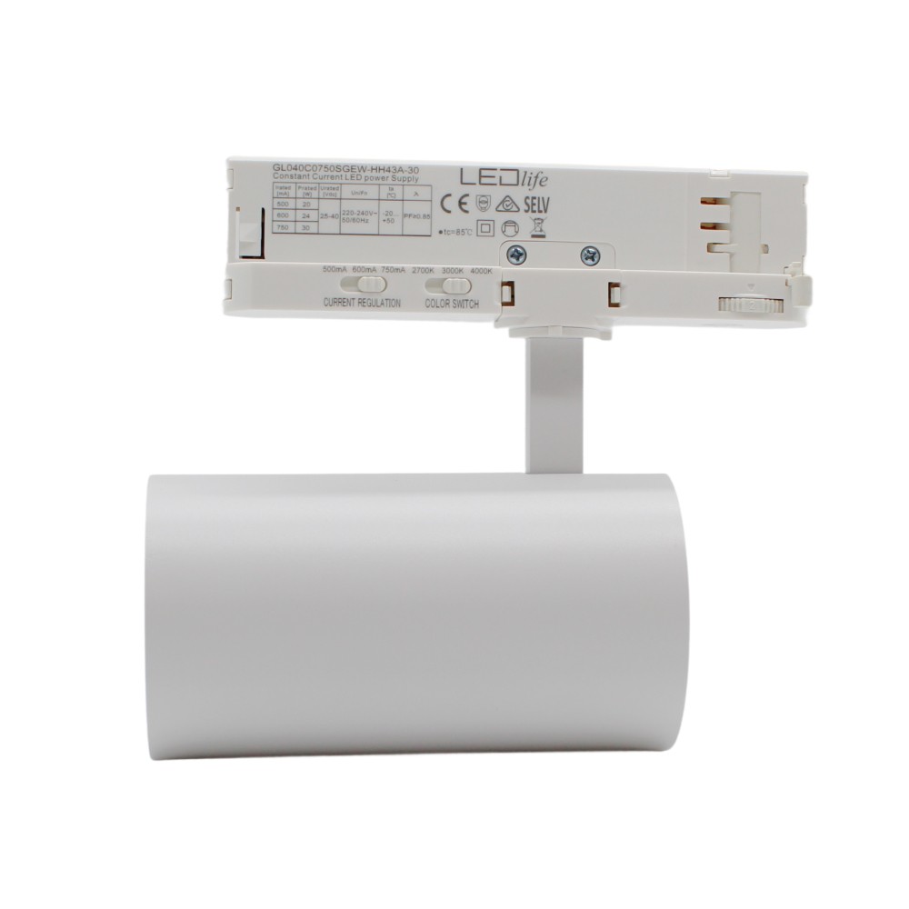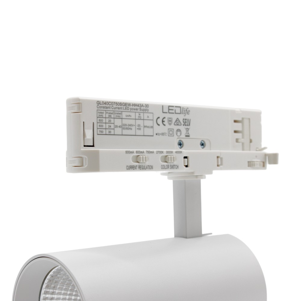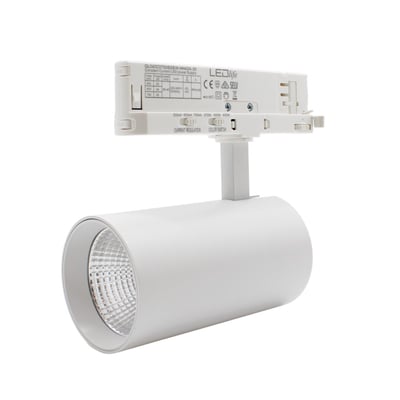 LEDlife CCT justerbar skinnespot med 28W effekt i hvid. Justerbar CCT og lysstyrke, 110lm/w, RA90, 3200lm og flicker free. Til 3-faset skinnesystem.