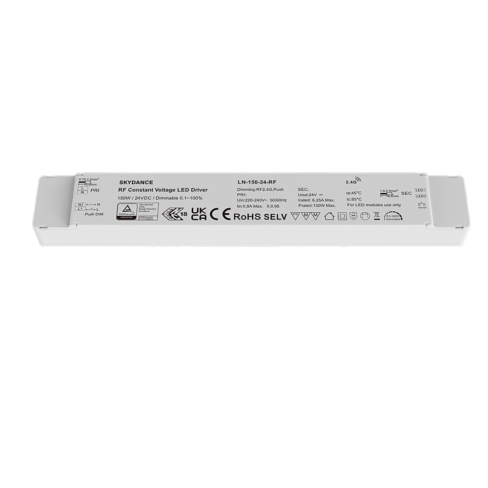 Dæmpbar 150W strømforsyning fra LEDlife med 24V DC, 6,25A, RF og push-dæmp funktion. IP20 klassificeret.
