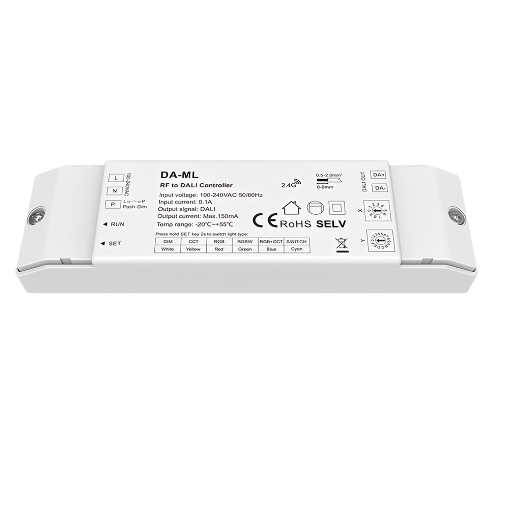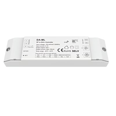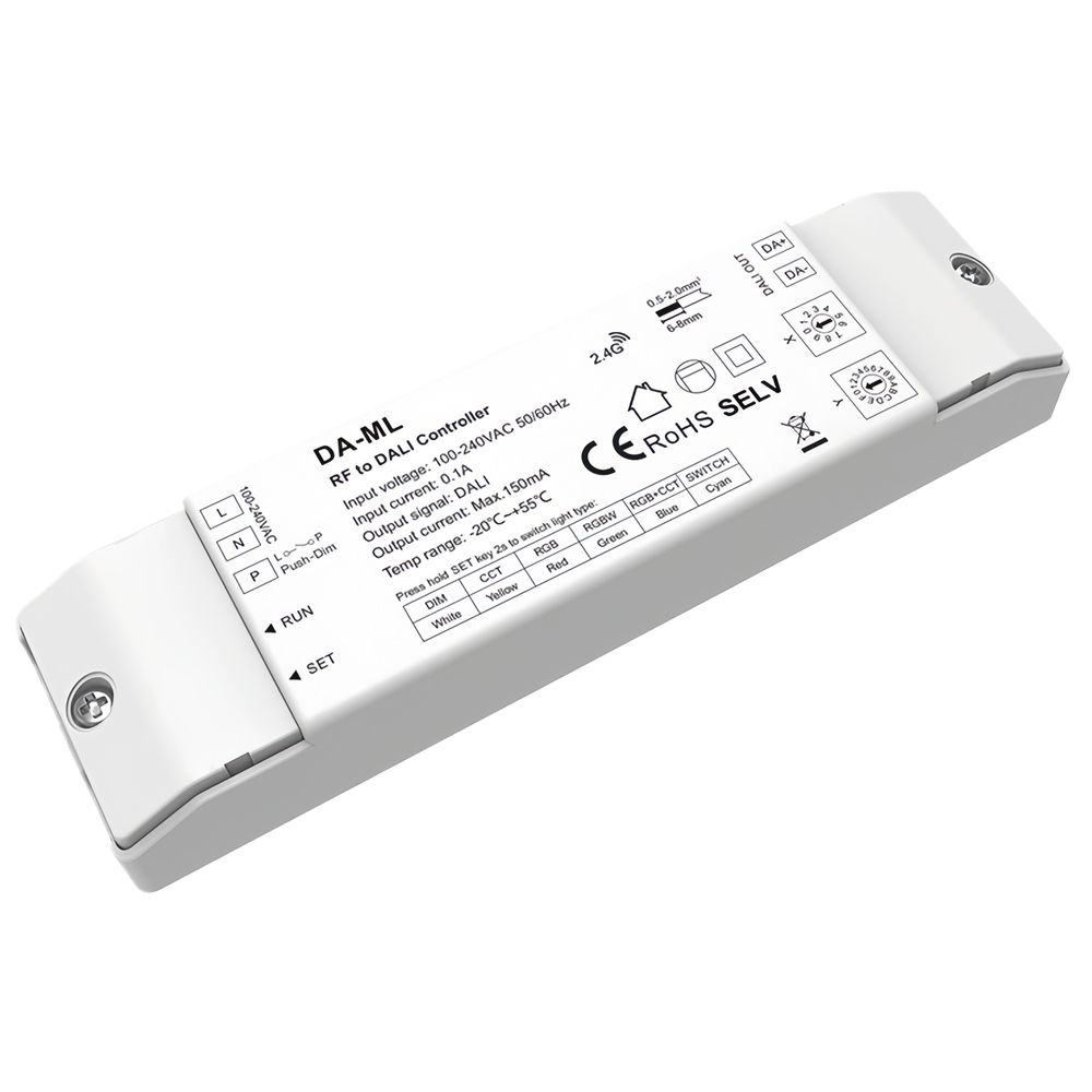 LEDlife rWave DALI controller med push-dim funktion. 2-vejs aflasting og 230V input. IP20-klassificeret.