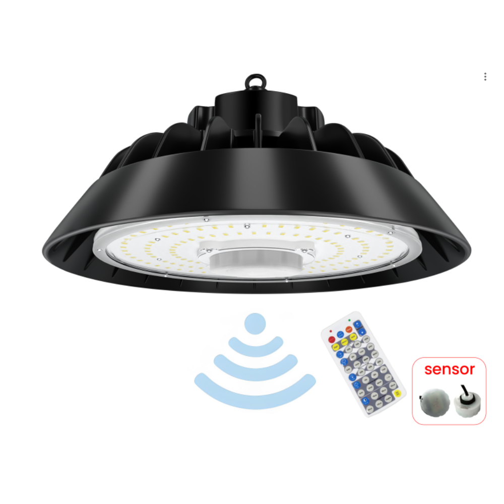 Kraftig 100W high bay med 150lm/W, indbygget lys- og bevægelsessensor, 4000K og 120° spredning. Aluminium, IP65.