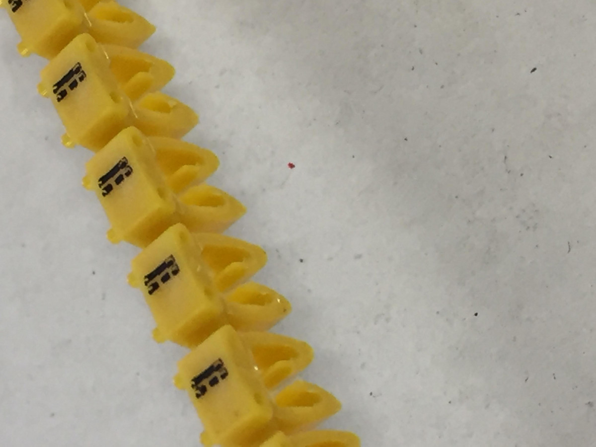 Mærker til ledninger på 1,5 - 2,5 mm². Traditionelle tegn med sort skrift på gul baggrund. Til jævnstrøm.