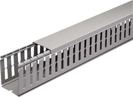 Grå ledningskanal (RAL 7030) i blyfri termoplastik. Modstandsdygtig over for syre, olier og smøreolie. Leveres i 2 meters længder.