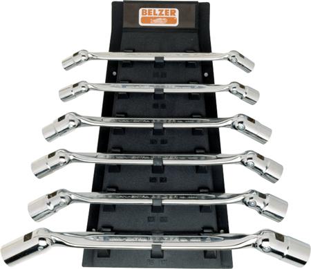 Sættet indeholder 6 dele: 8 x 9 mm, 10 x 11 mm, 12 x 13 mm, 14 x 15 mm, 16 x 17 mm, 18 x 19 mm. Begge hoveder kan dreje 180°. Leveres i sort plastvægholder.