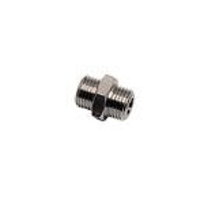 Reduktions brystnippel med udv. BSPP og metrisk gevind. Materiale: forniklet messing. Overholder ROHS.
