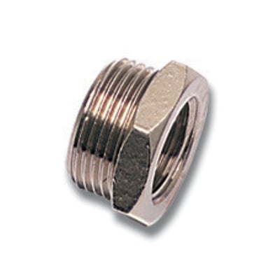 Legris reduktionsmuffe med udv./indv. BSPP og metrisk tilslutning. Materiale: forniklet messing.