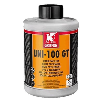 Griffon Uni-100 GT er en tixotropisk, spaltefyldende PVC lim med lang åbningstid, ideel til store rør op til 800 mm. Sørg for at rense overflader før brug.