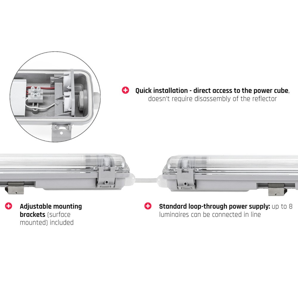 Armaturet er konstrueret i holdbart plastmateriale og har en isoleringsklasse II, der garanterer sikker drift. Det er kompatibelt med en standard 230V strømforsyning og anvender G13-fatninger til nem installation af LED rør. Med et temperaturområde fra -20°C til +40°C er det velegnet til en bred vifte af klimaer.