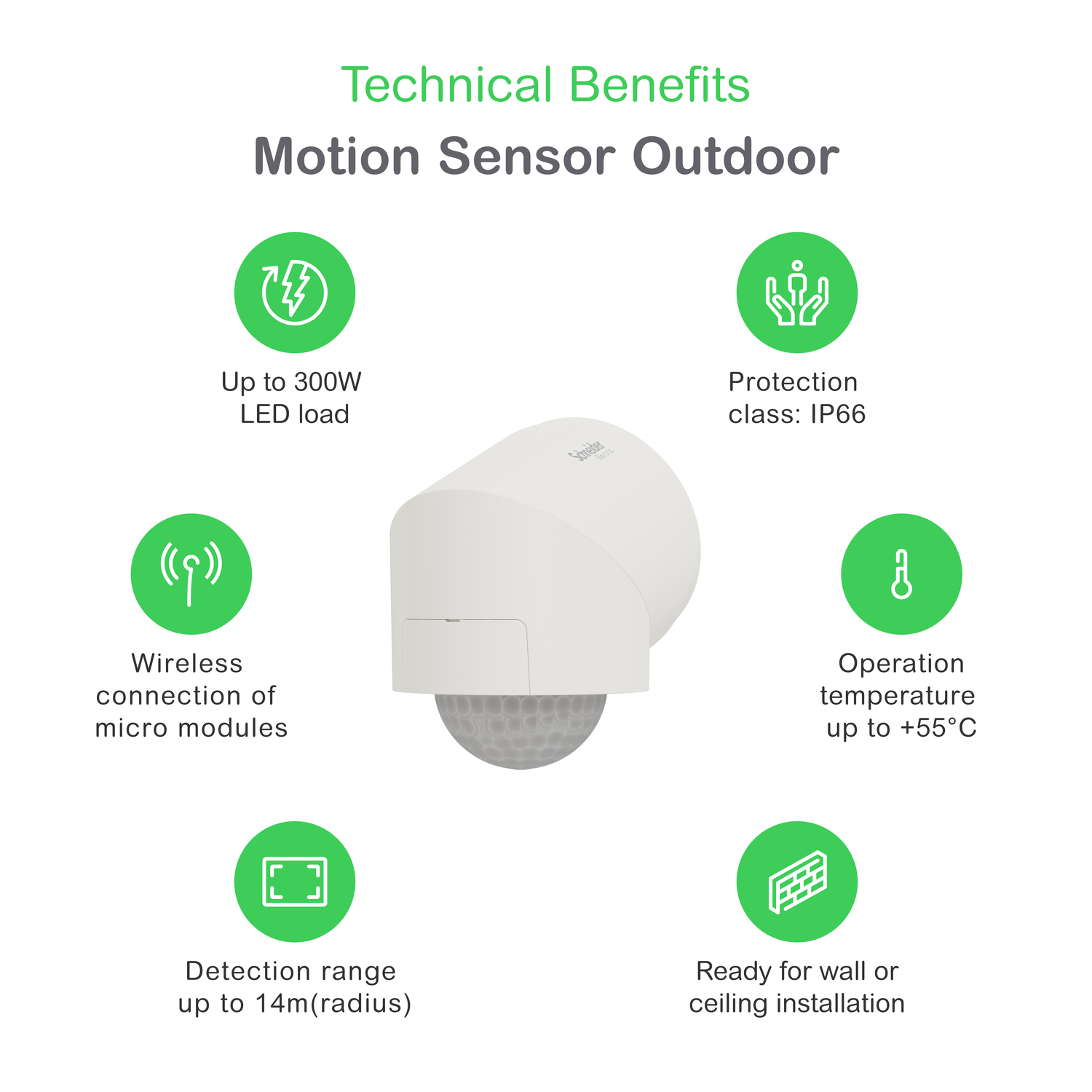 Denne bevægelsessensor er ideel til udendørs brug, hvor den automatisk kan tænde lyset, når der registreres bevægelse. Dette forbedrer sikkerheden og trygheden omkring din bygning. Ved integration i et Wiser-system åbnes der op for yderligere smarte funktioner og tilpasningsmuligheder.