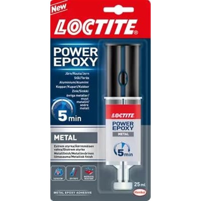 Loctite Power Metal epoxylim er ideel til hurtige reparationer af lækager i ledningsrør og metaltanke. Den har en meget høj bestandighed mod olie, benzin og fortyndede syrer, og giver metalfarvede limfuger. Epoxylim hærder efter 5 minutter, og opnår fuld styrke efter 24 timer. Trækstyrken er maks. 140 kg/cm2.