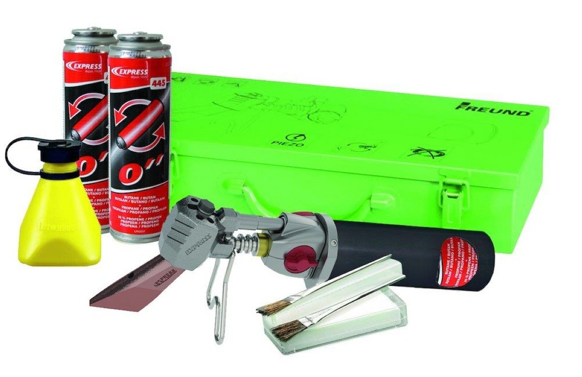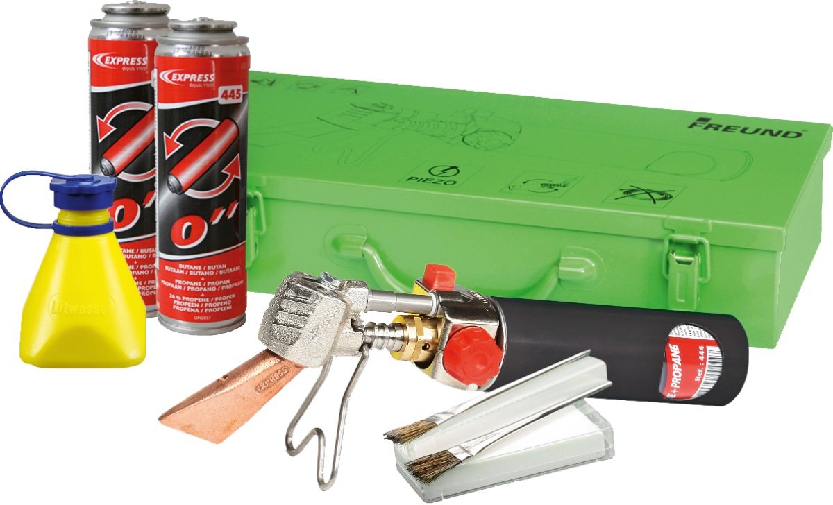 Express/Freund gasloddekolbesæt med piezotænding. INGEN slanger og store gasflasker. Smart loddekolbe, ideel til reparationer. Leveres i metal-transportkasse inkl. 2 x 110 ml.