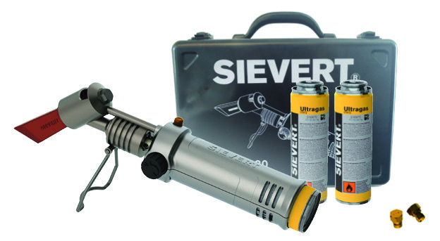 Transportabel loddekolbe i titanium og aluminium fra Sievert. Ergonomisk håndtag med integreret gasdåse. Ideel til pladearbejde og VVS.