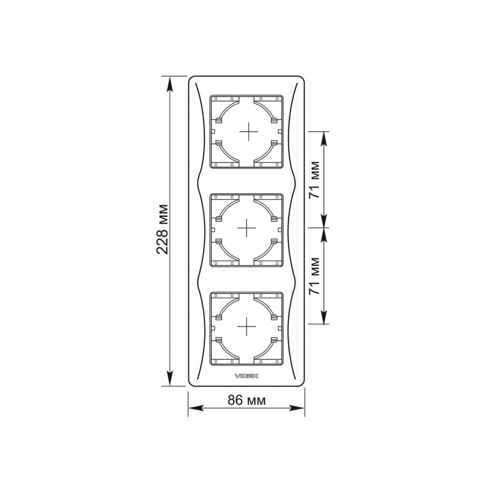 En sort, 3-polet vertikal ramme med dimensionerne 228x86x9 mm og IP20 klassifikation.
