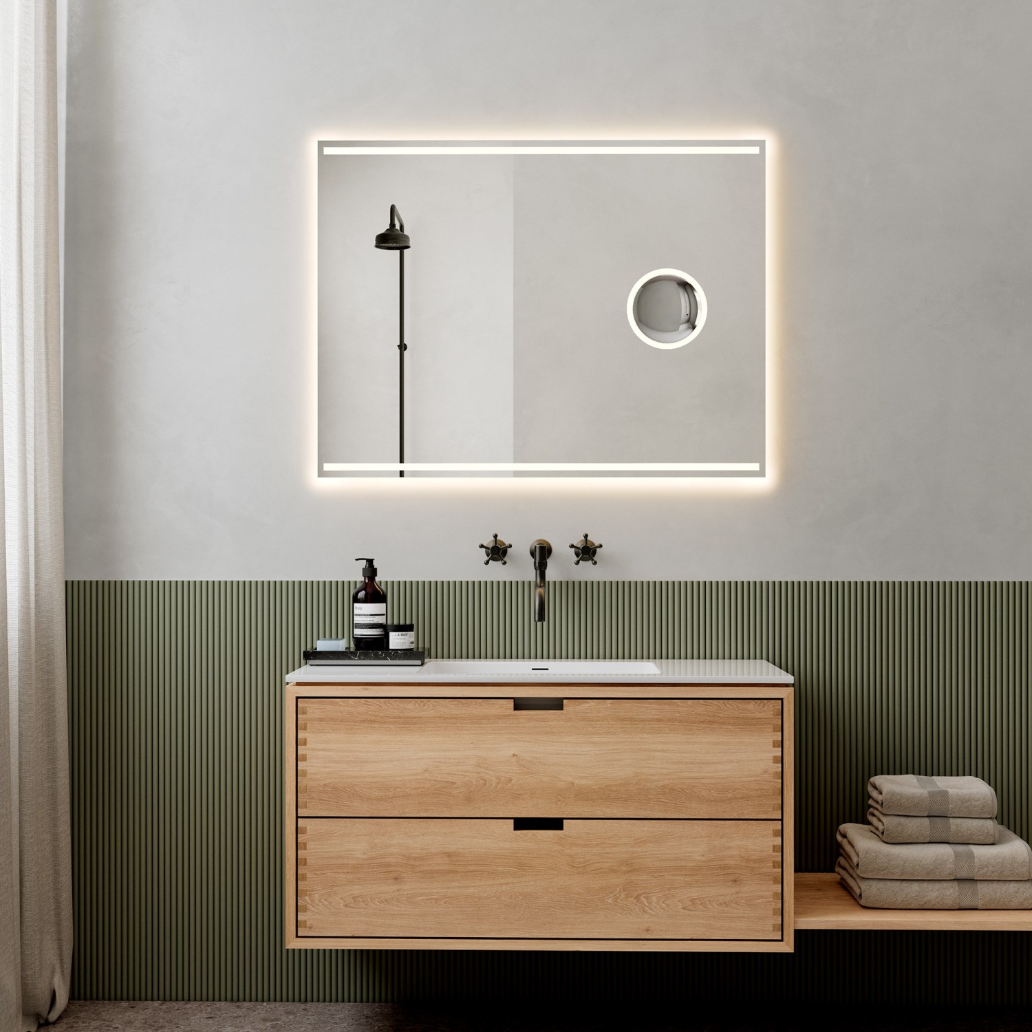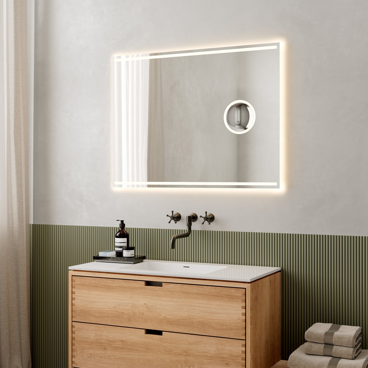 Loevschall Focus spejl med integreret makeup spejl og lys. Måler 100x75 cm og har en dybde på 2,5 cm.