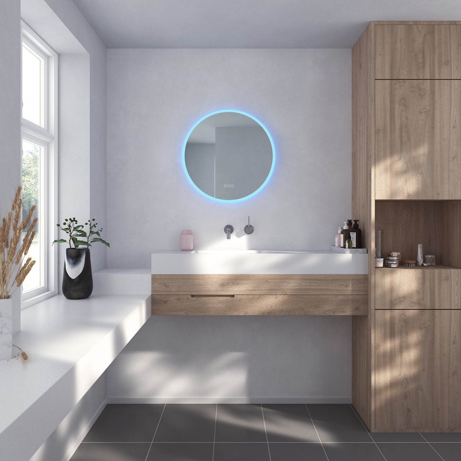 Smart rundt spejl med integreret LED-lys, der kan justeres i farvetemperatur fra 2100-6500 K og dæmpes. IP44-klassificeret.