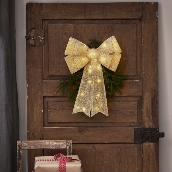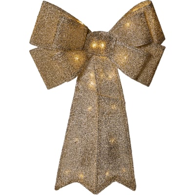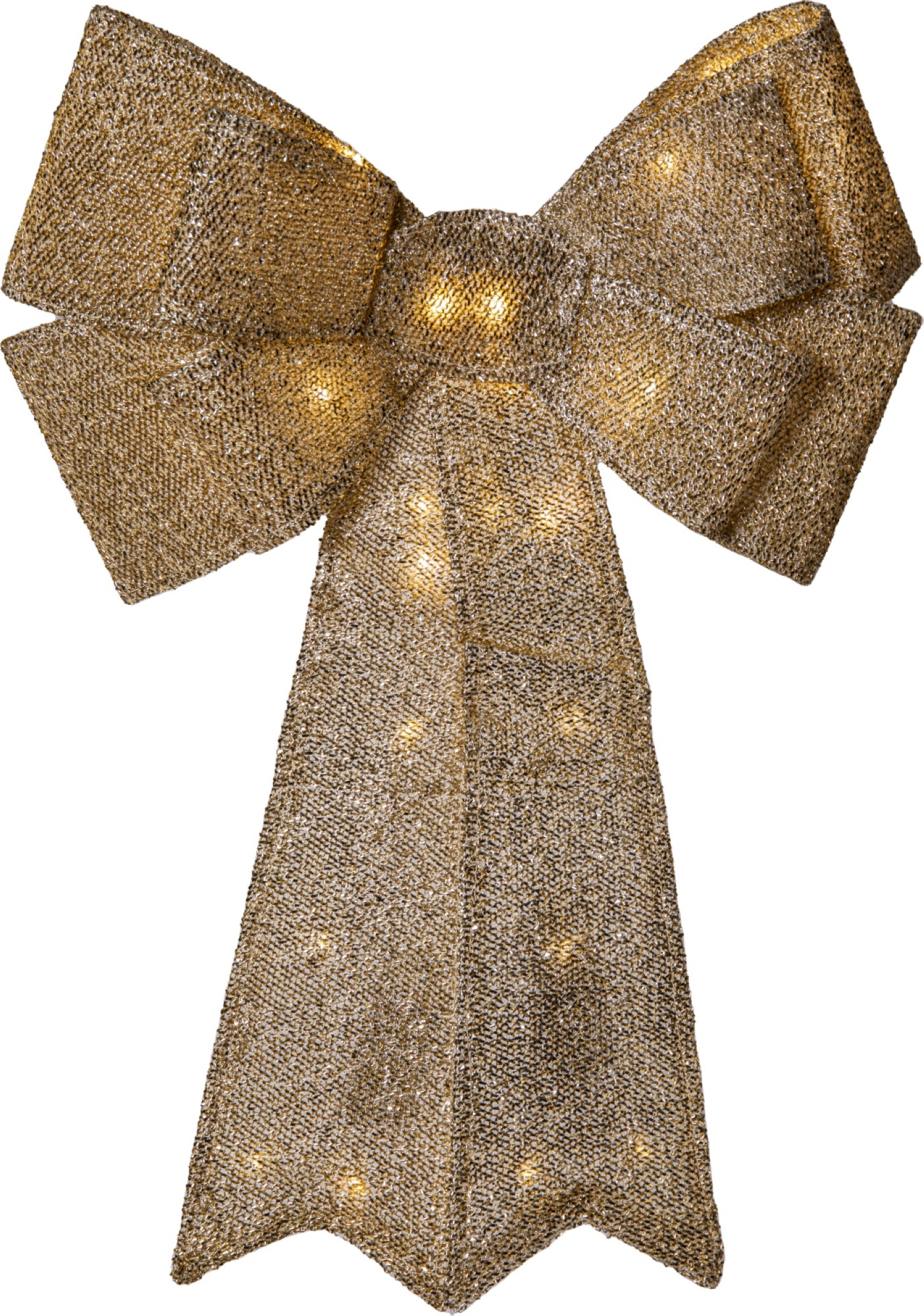 Dekorativ Lotta sløjfe fra Star Trading i guld med varmt hvidt lys, ideel til indendørs brug. Inkluderer timerfunktion.